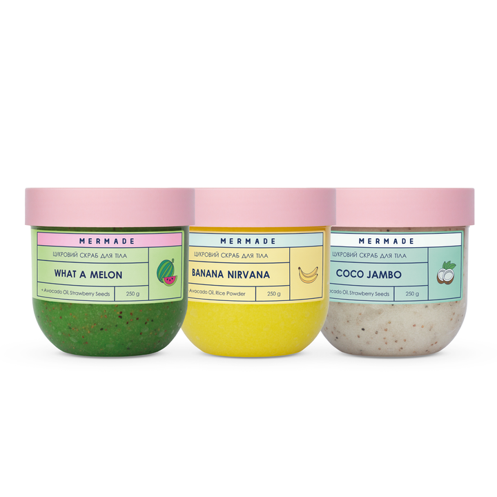 Набір із трьох ароматних скрабів MERMADE — твій must-have для м’якої, гладенької шкіри та затишного душевого ритуалу, де кожен аромат створює свій настрій. Ідеальний варіант, щоб спробувати всі бестселери одразу або подарувати комусь частинку теплоти. Користуйся щодня й відчуй різницю вже після першого застосування.
