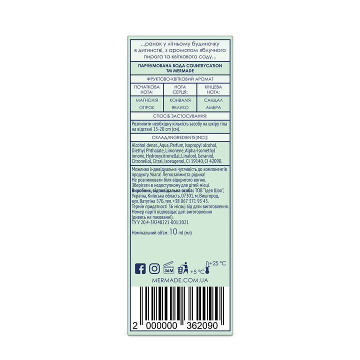 COUNTRYCATION- свіжий грейпфрут, магнолія й огірок м’яко розкриваються в серці з яблуком, туберозою й конвалією, завершуючись нотами сандала та амбри.