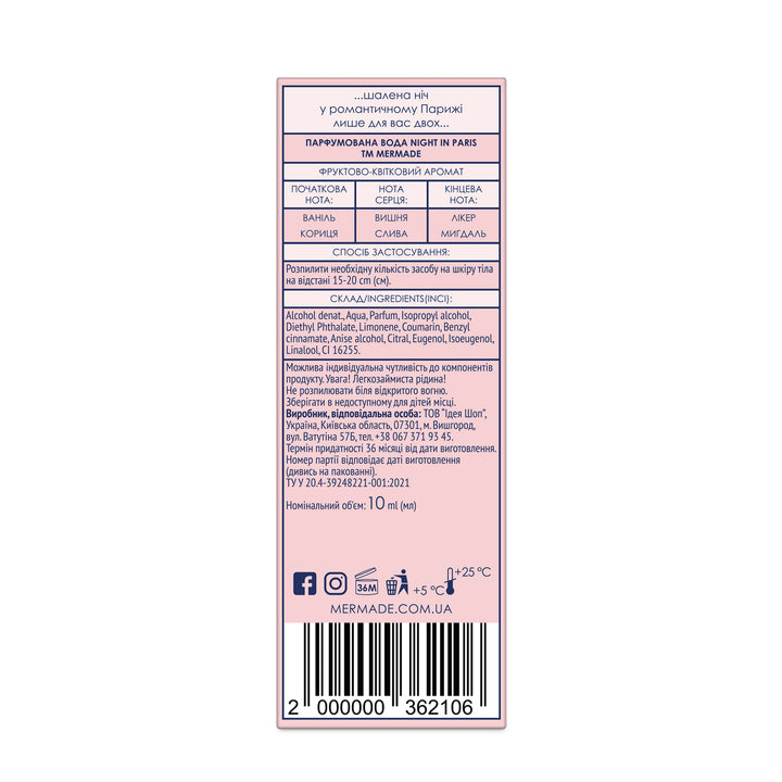 NIGHT IN PARIS - стигла вишня, гіркий мигдаль і теплий лікер переходять у солодку сливу з жасмином, залишаючи пряний шлейф ванілі, кориці та гвоздики.