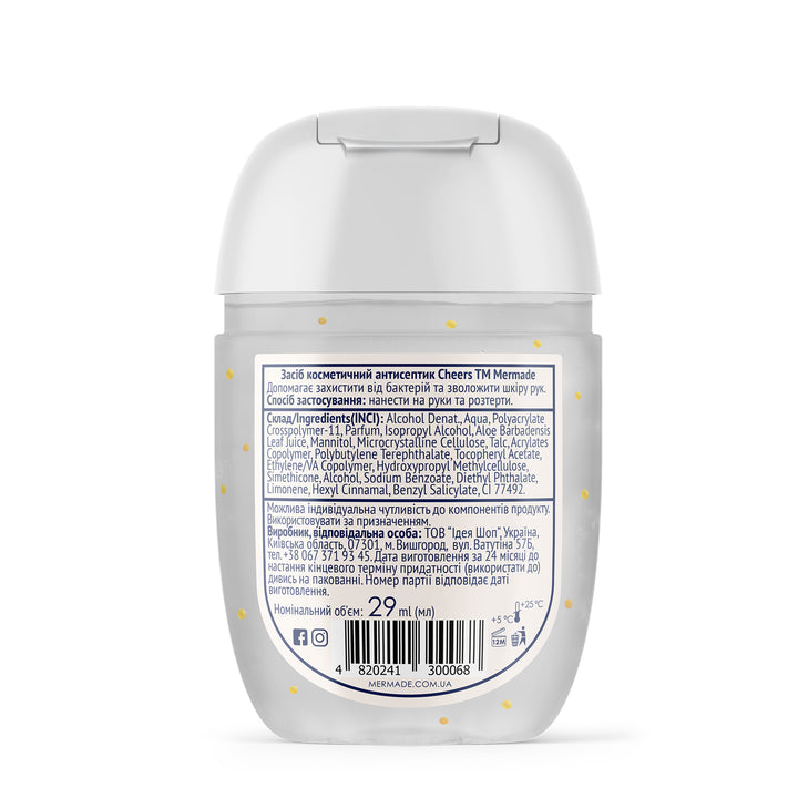 Гелевий антисептик MERMADE Cheers з ароматом твого улюбленого ігристого напою — це максимум фану та користі разом. Засіб не пече, не стягує шкіру та не липне, а завдяки сферам з вітаміном Е прекрасно зволожує та доглядає за дермою. Санітайзер для рук з ароматом вечірки щоразу нагадуватиме тобі про найвеселішу паті у твоєму житті.