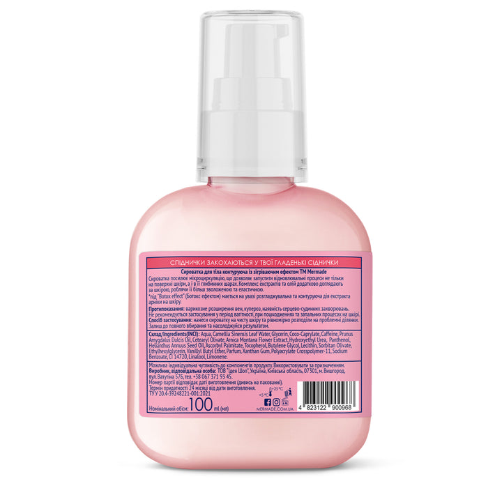 Нанеси сироватку на бажані зони, це може бути зона стегон, сідниць та, навіть, зона шиї та декольте. Уникай потрапляння на слизові оболонки. Сироватка не потребує змивання. Її можна лишати на тілі після нанесення. Перед використанням проведи патч-тест на виявлення алергічних реакцій.