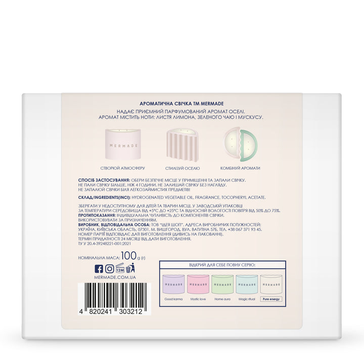 Запали ароматичну свічку MERMADE Pure Energy — вона візьме на себе настрій та простір. Увімкни легку музику, переодягнися у зручненьке. І відчувай, наповнюйся, лови зв'язок з вогником творчості. На що він надихне тебе сьогодні?