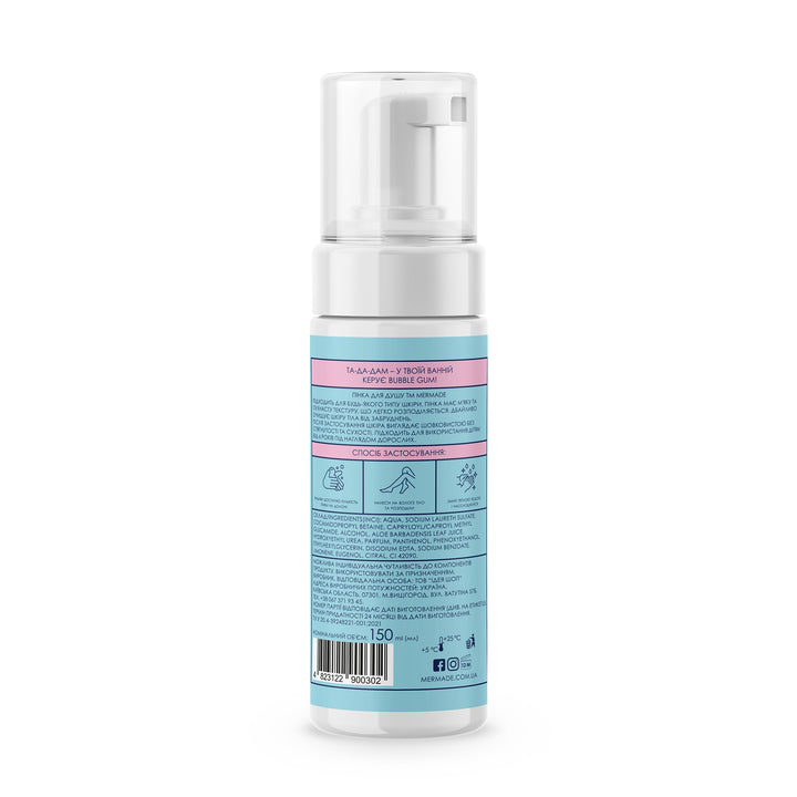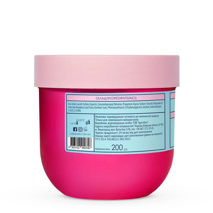 Склад: Пінка для душу MERMADE Bubble Gum — Aqua, Sodium Laureth Sulfate, Cocamidopropyl Betaine, Capryloyl/Caproyl Methyl Glucamide, Alcohol, Aloe Barbadensis Leaf Juice, Hydroxyethyl Urea, Parfum, Panthenol, Phenoxyethanol, Ethylhexylglycerin, Disodium EDTA, Sodium Benzoate, CI 42090. Обʼєм: 150 мл.