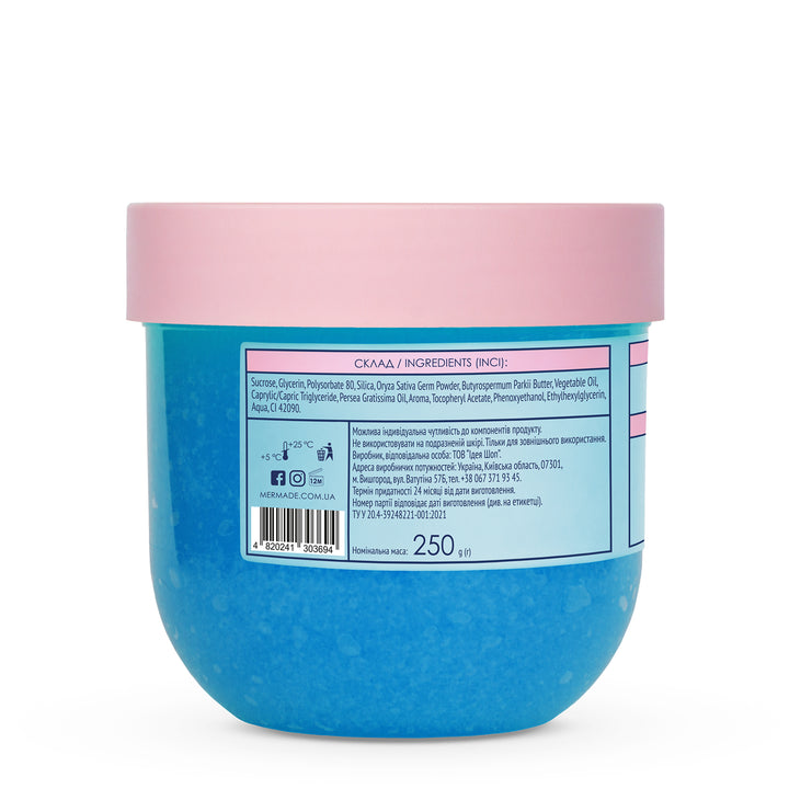 Склад: Цукровий скраб для тіла MERMADE Magic Unicorn — Sucrose, Glycerin, Polysorbate 80, Silica, Oryza Sativa Germ Powder, Butyrospermum Parkii Butter, Vegetable Oil, Caprylic/Capric Triglyceride, Persea Gratissima Oil, Parfum, Tocopheryl Acetate, Phenoxyethanol, Ethylhexylglycerin, Aqua, Calcium Aluminum Borosilicate, [+/- May contain: CI 42090, CI 16255, CI 77820]. Обʼєм: 250 г.