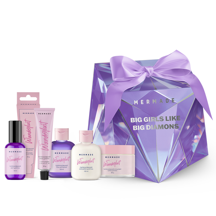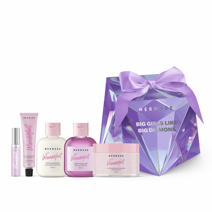 Цей набір створений для дівчини, яка закохана у життя, шукає нові відчуття та вміє бачити красу у дрібницях. Wanderlust — це не просто догляд, це цілий ритуал із квітково-деревним ароматом, що огорне її жасмином, трояндою та теплом кедра. Упакований у коробку-діамант, він стане ідеальним подарунком, щоб сказати: "Ти особлива".