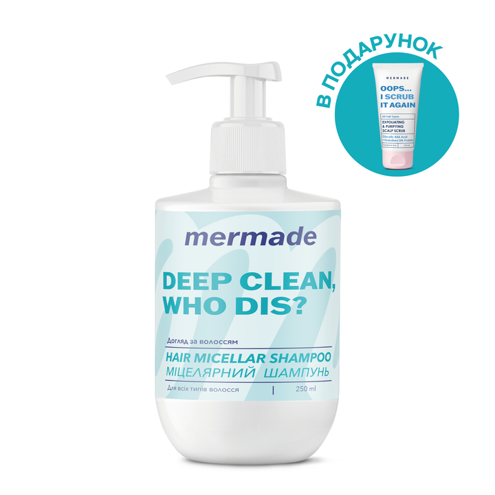 До речі, зараз при купівлі міцелярного шампуню — пілінг для шкіри голови MERMADE АНА Acid & Silk protein в подарунок!