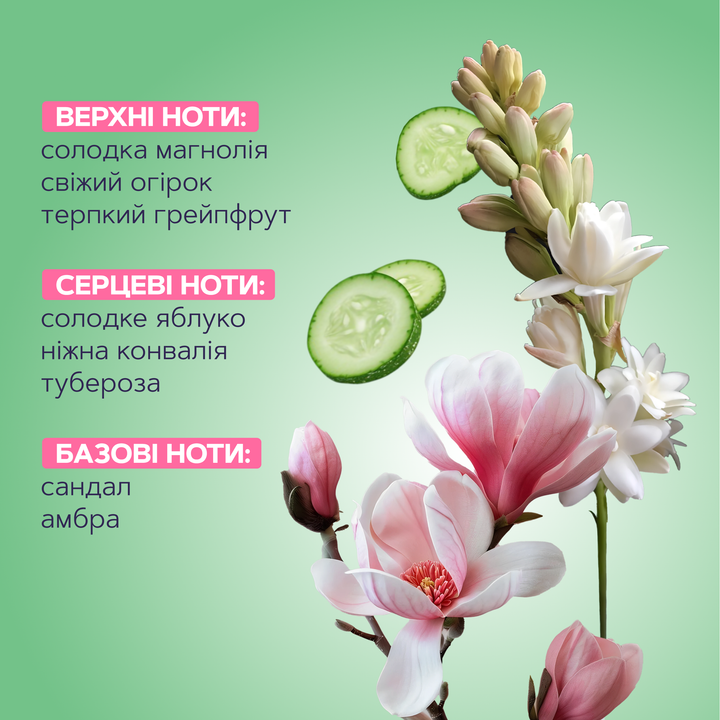 Композиція розкриється солодкою магнолією і свіжим огірком. Серцеві ноти перенесуть тебе в яблуневий сад. А сандал і амбра створять невагомий шлейф дорогих серцю спогадів.