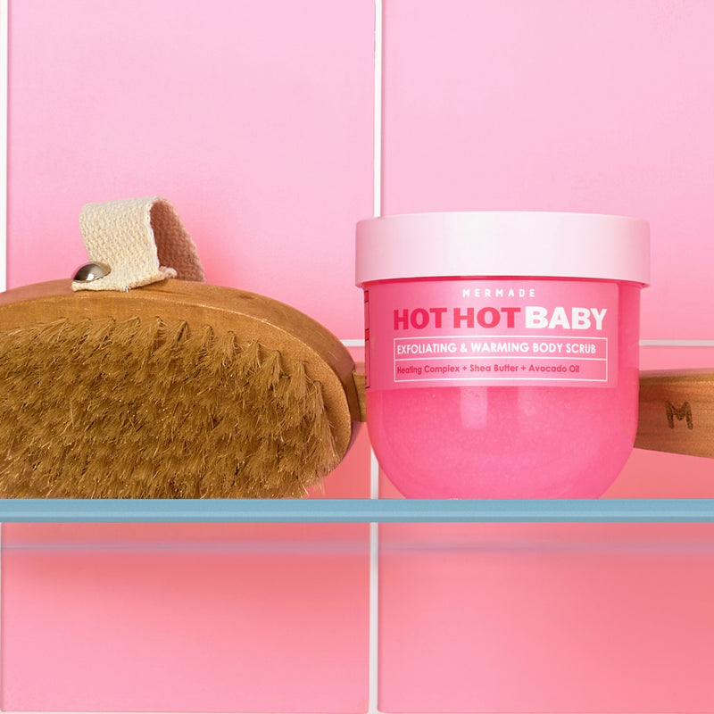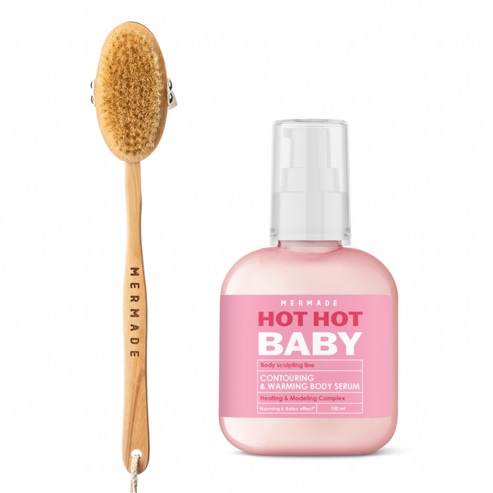 Суха щітка: перед душем масажуй суху шкіру тіла впродовж 3–5 хвилин, рухаючись знизу догори. Уникай зони декольте та чутливих ділянок. Повторюй процедуру 2 рази на тиждень для стимуляції кровообігу та зменшення проявів целюліту.