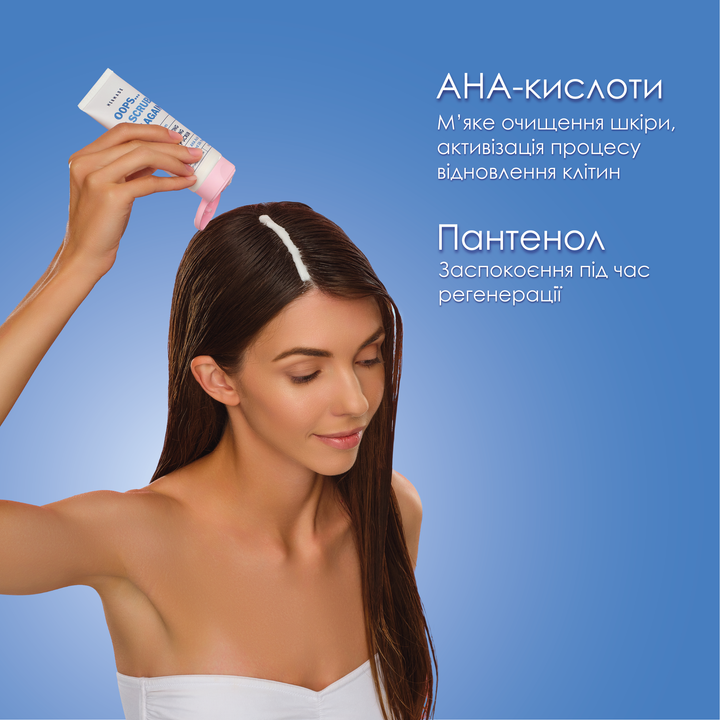 Перед миттям нанеси на вологу шкіру голови та ніжно помасажуй кінчиками пальців або силіконовим масажером. Після ретельно змий скраб теплою водою.