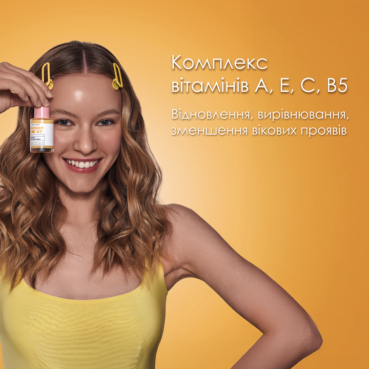 Сироватка збагачена вітамінами А, Е, С і В5, які вирівнюють тон, освітлюють шкіру та надають їй природного сяйва.
